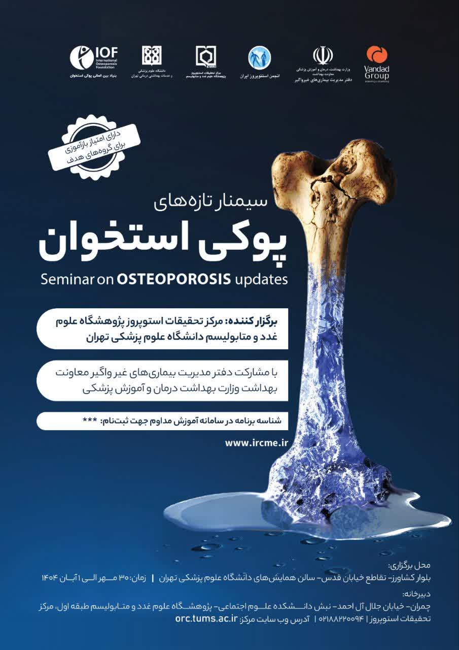 The Osteoporosis Research Center of the Endocrinology and Metabolism Research Institute, Tehran University of Medical Sciences, in line with the National Bone Health Week programs, is honored to organize the 20th Symposium on Osteoporosis Updates with the participation of distinguished professors and experts in the field, aiming to enhance the scientific knowledge of the medical community.