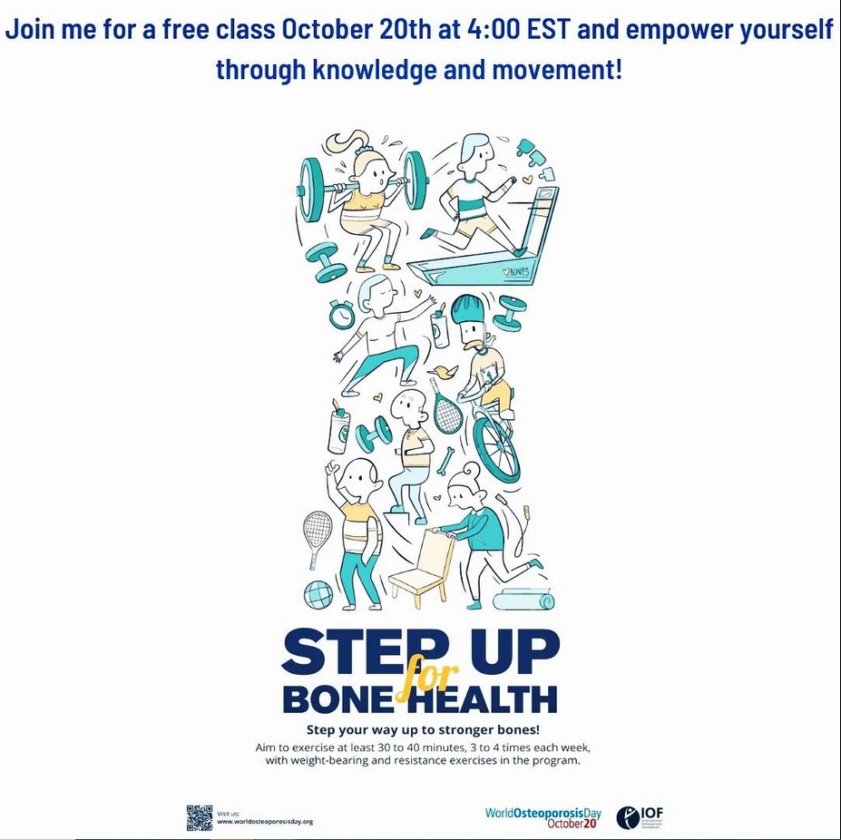 Research shows that regular physical activity is integral to a bone-healthy lifestyle. Let’s come together on Thursday, October 20th, team! Using my training as a Bone-Health Exercise Coach, we will enjoy a 30-minute class where I will show you how to create strong bones and a mobile, fracture-free future.