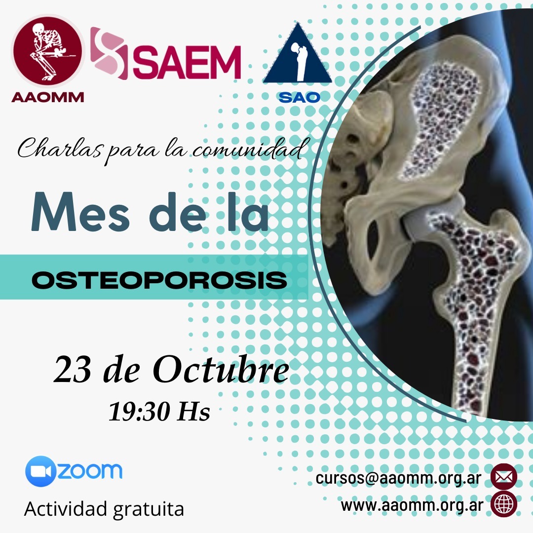 Hablaremos de Nutrición - Actividad Física - Exposición solar y factores de riesgo. Prevención de caídas. Link de acceso: Tema: Mes de la Osteoporosis - Charlas para la comunidad - AAOMM-SAO-SAEM Hora: 23 oct 2025 19:30 Buenos Aires, Georgetown