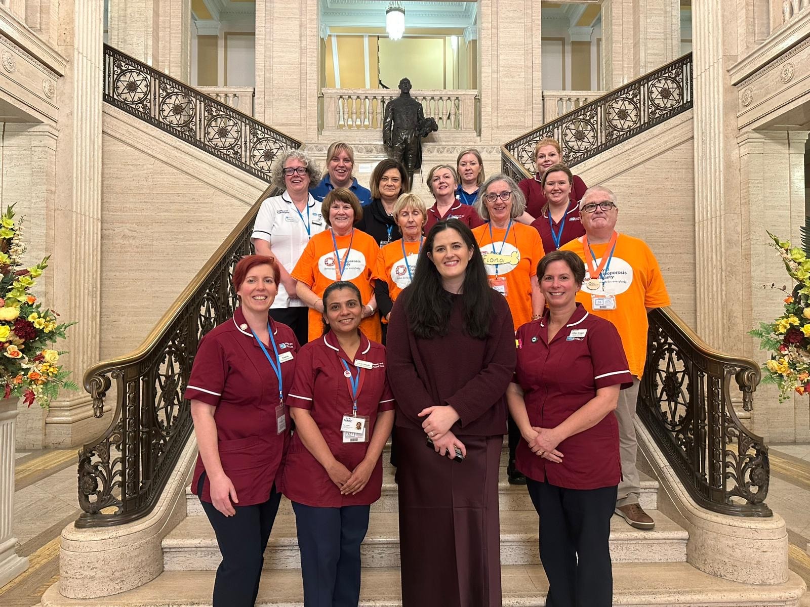 1.Claire Sugden MLA (Chair of All Party Group on Aging and Older People) with NI FLS nurses, ROS volunteers, Belfast Trust Community Falls Team and Radiographers on the stairs at Stormont