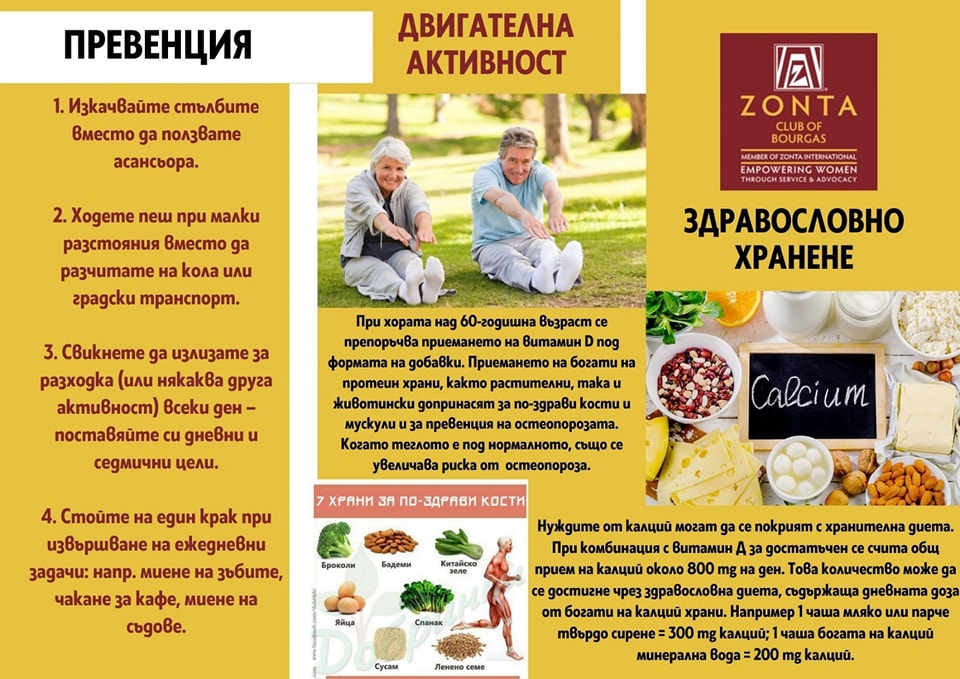 Zonta Club of Burgas organises an information campaign aimed at the general public to raise awareness of osteoporosis. Together with facts about the disease and its consequences, the Club offers advise on nutrition and exercise as an important part of prevention.