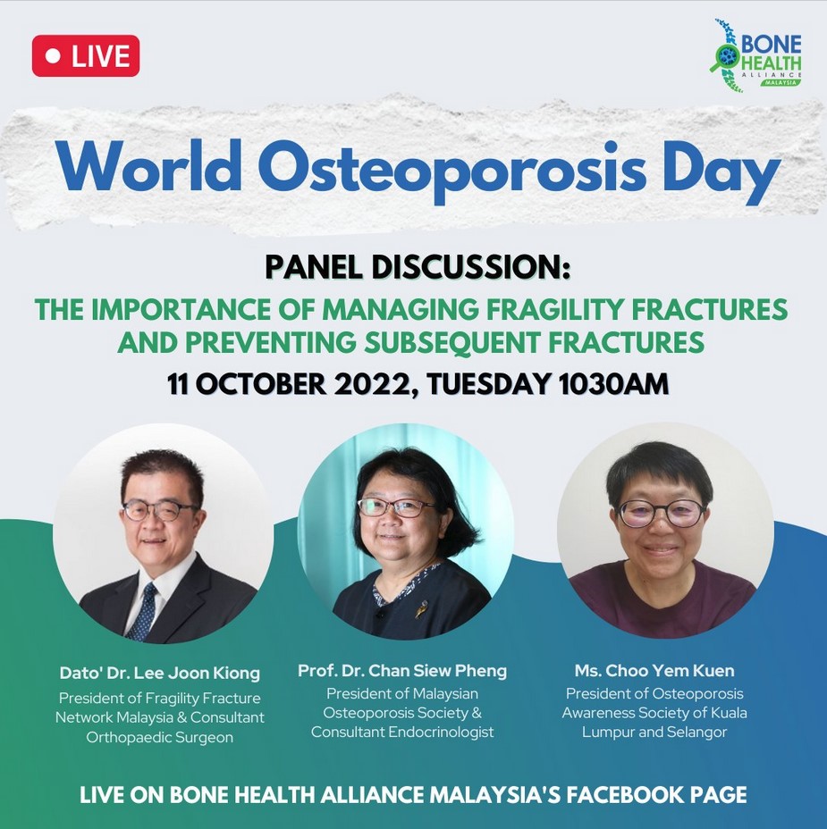 To fill the awareness gap among Malaysians on the reality of poor bone health as a serious health issue and highlight its consequences, BHAM is excited to bring you a Facebook live session featuring leading experts who will be sharing insights on the importance of managing fragility fractures and preventing subsequent osteoporotic fractures.