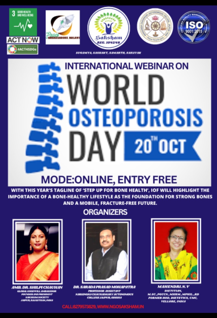 An Online International Webinar for the public on World Osteoporosis Day 20th October on "Importance of Bone Healthy Lifestyle" is organized by Saksham Society Jaipur Rajasthan, North India, an NGO, on 20th October 4-5pm. I'm a practicing Clinical Dietitian, Ms.Mahendri NV. MSc.MHRM. MPhil.RD., [Former (Retired) Head, Dept of Dietetics, CMC, Vellore] residing in Tumkur, South India will be the speaker of this event. This is the third successive program for the celebration of "World Osteoporosis Day" from us Dn.Mahendri .N. V and Dr Shilpi Chouhan, Founder President ,Saksham Society Jaipur, Rajasthan.