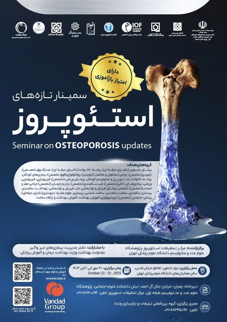 Seminar on Osteoporosis Updates On the Occasion of National Bone Health Week (19–25 October 2025) Theme: Stop the Neglect of Bone Health The Osteoporosis Research Center is pleased to announce the upcoming Seminar on Recent Advances in Osteoporosis, organized in recognition of National Bone Health Week (19–25 October 2025) under the theme “Stop the Neglect of Bone Health.” Seminar Details Date: 21–23 October 2025 (29 Mehr – 1 Aban 1404) Time: 08:00 – 13:30 Venue: Conference Hall, Central Building, Tehran University of Medical Sciences Registration Fee: Free (CME-accredited) Organizers: Osteoporosis Research Center of Endocrinology and Metabolism Research Institute of Tehran University of Medical Sciences in collaboration with the Ministry of Health and the Iranian Osteoporosis Society Target Audience General practitioners, family physicians, rheumatologists, endocrinologists, orthopedic surgeons, neurosurgeons, physiotherapists, pharmacists, public health specialists, healthcare management professionals, obstetricians and gynecologists, health educators, community health experts, physical medicine specialists, geriatricians, nutritionists, radiologists, epidemiologists, and other related fields. Scientific Committee Chair of the Seminar: Prof. Bagher Larijani, Professor, Tehran University of Medical Sciences Scientific Secretary: Dr. Noushin Fahimfar, Assistant Professor, Tehran University of Medical Sciences Registration Participants are invited to register via the Continuing Medical Education (CME) portal.(https://www.ircme.ir/)