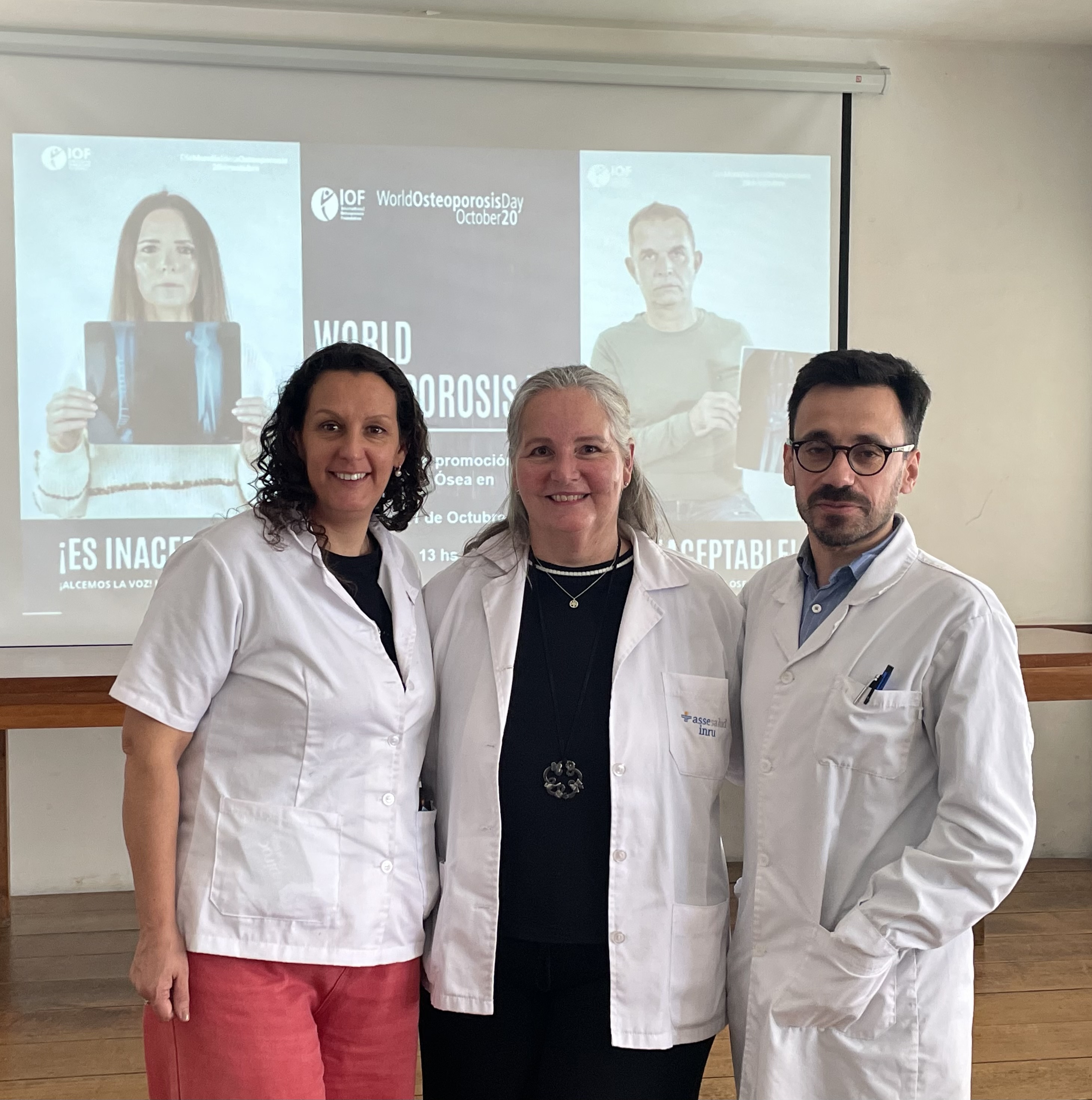 Organized by Academy Unit of Rheumatology from the Uruguayan Republic University, UDELAR and the Study Group of Osteopathies from the Uruguayan Society of Rheumatology. Update on OP management in the context of WOD 2025 International Campaign. In the photo, Dr Carolina Vargas, Dr Cristina Romariz and Dr Alejandro Fernandez.