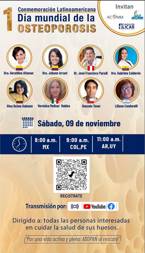 Join us for this important event coming up next Saturday, November 9th. On that day, experts from Colombia, Peru, Ecuador, Mexico, Chile and Argentina will share vital knowledge about bone health care and osteoporosis prevention.