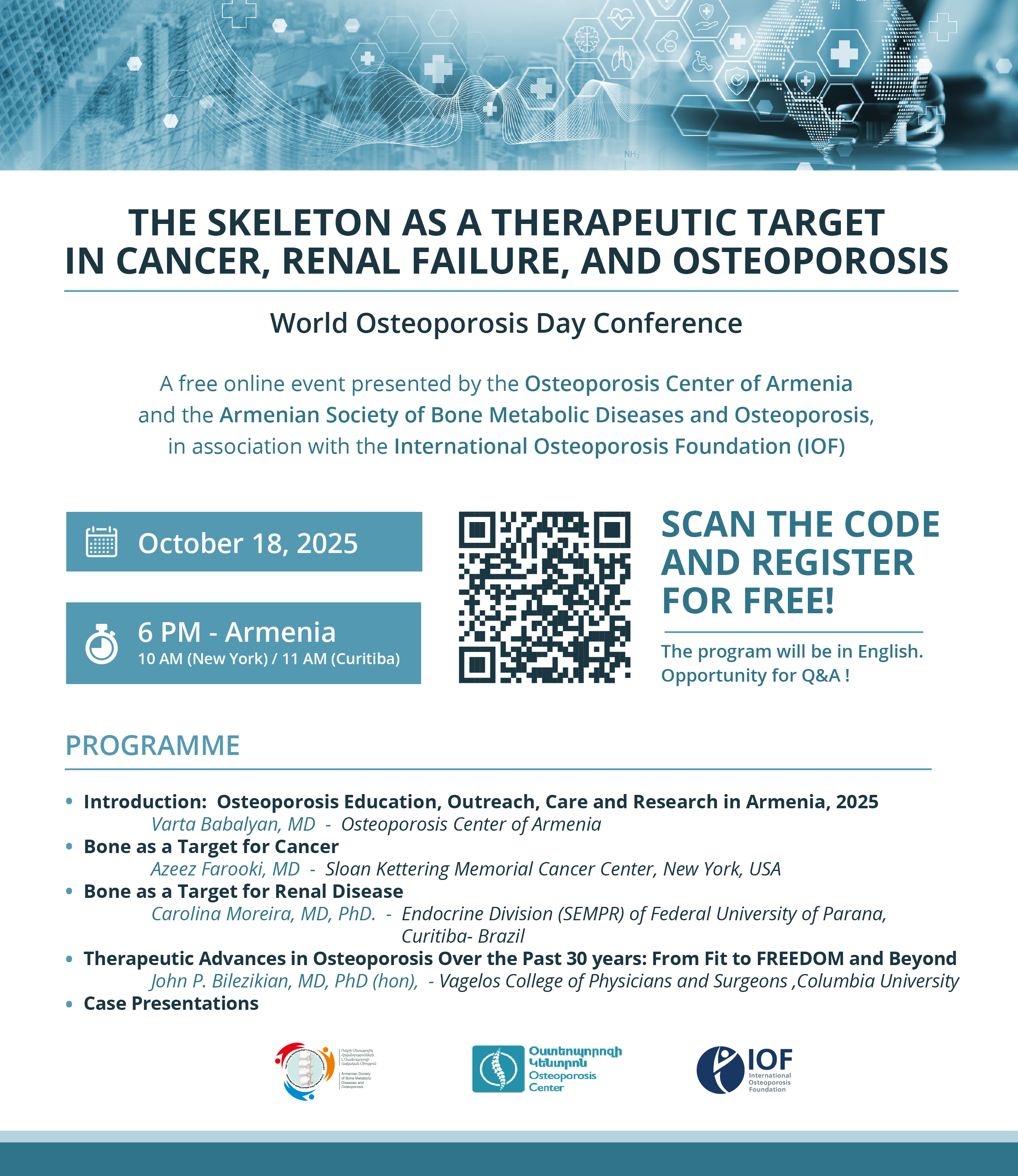 On October 18, 2025, the Armenian Society of Metabolic Bone Diseases and Osteoporosis, under the leadership of Professor John Bilezikian, Founder of the Osteoporosis Center in Armenia, held a hybrid scientific conference dedicated to World Osteoporosis Day. The event was organized with the informational support of the International Osteoporosis Foundation (IOF).