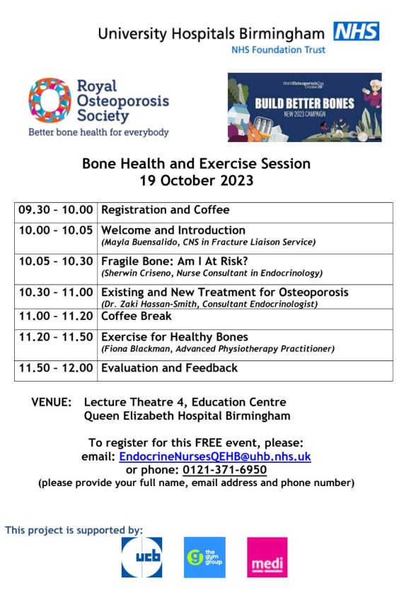21 October 2023: Community Outreach Education Session on Bone Health and Exercise (3 simultaenous sessions: Birmningham, West Bromwich and Tamworth) for members of the public.