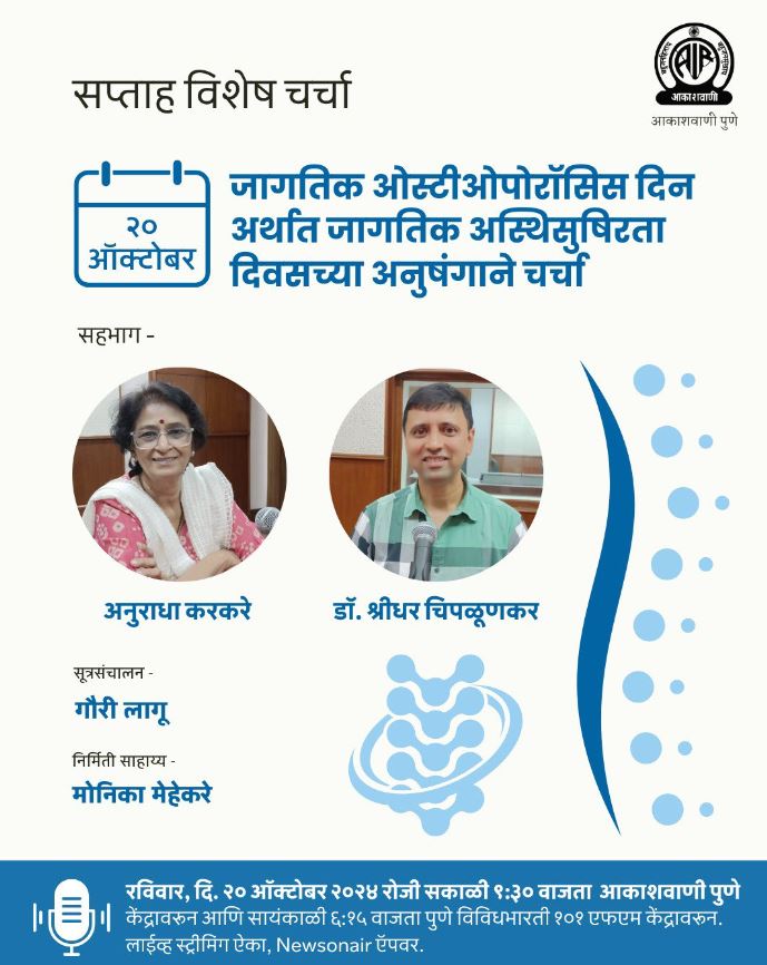 Listen to the Saptah Vishesh Charcha - Senior Citizen and Health, on the occasion of World Osteoporosis Day on October 20 - Sunday, 20th October 2024 at 9:30 am from Akashvani Pune Centre.