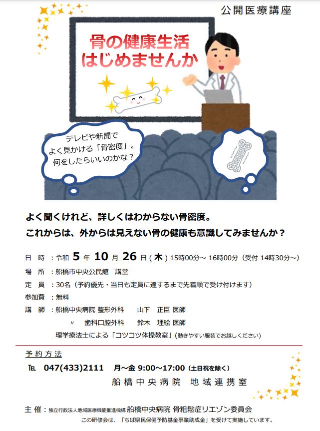 Lecture on osteoporosis to be held at Funabashi Central Community Center, 2-2-5 honcho Funabashi