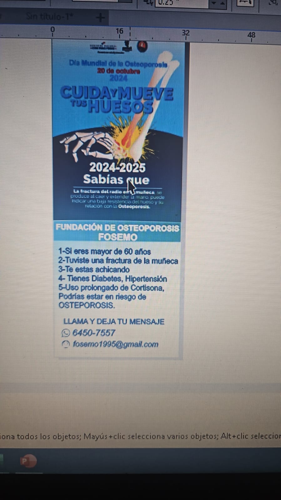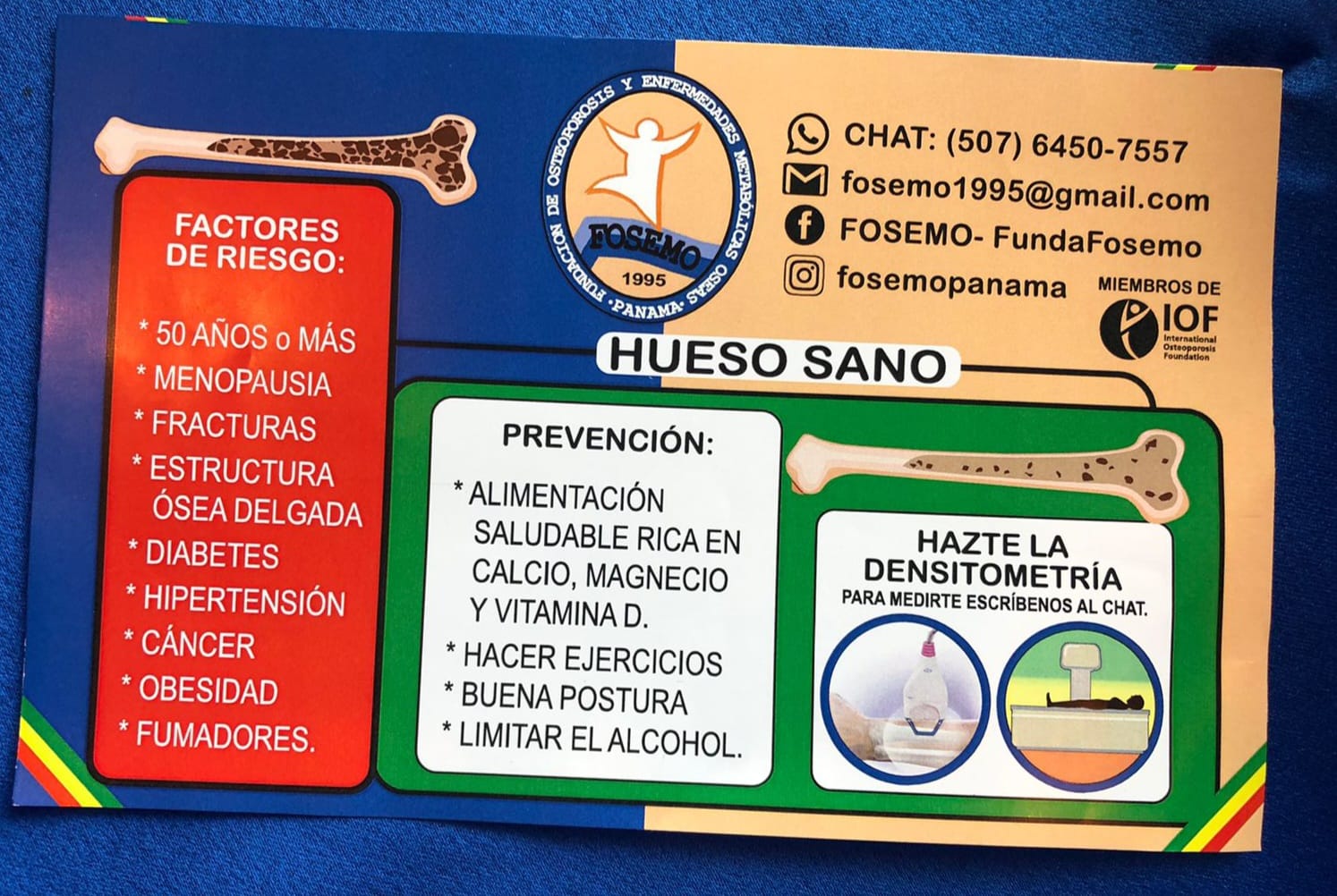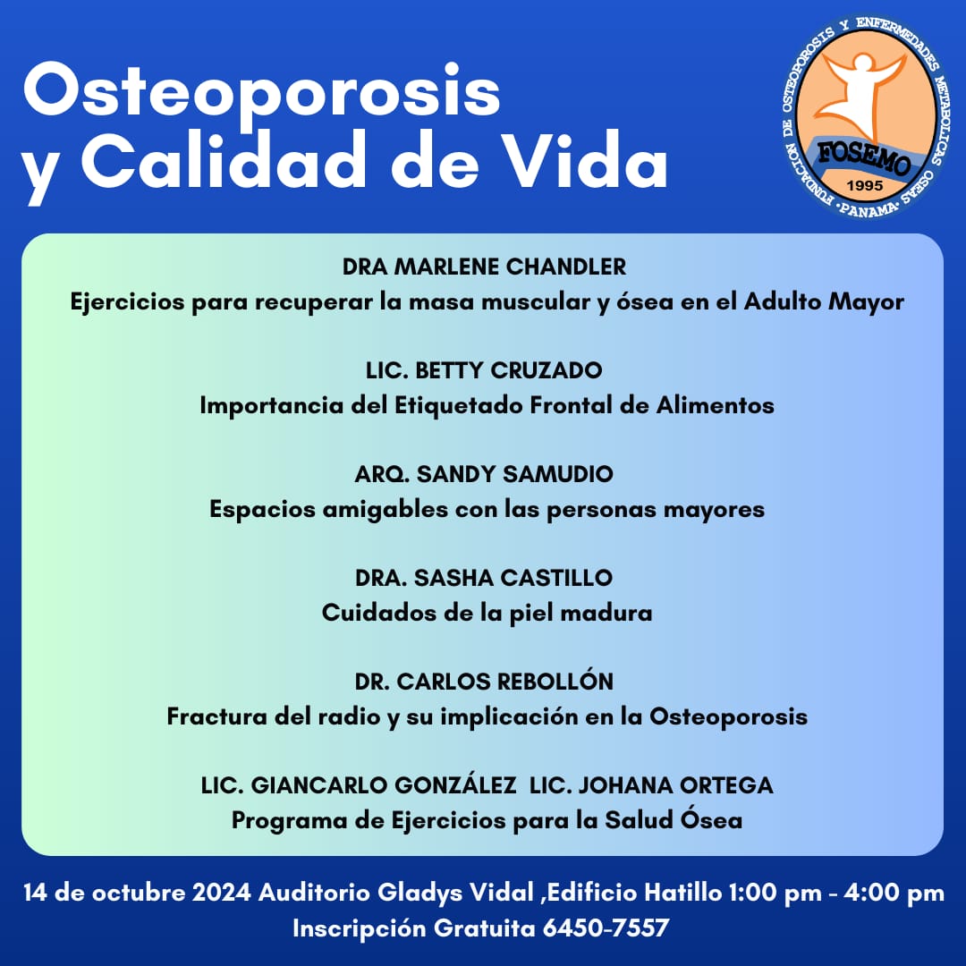 For persons 50 to 70 years old. Topics: Bone and muscular nutrition, exercises, falls and wrist fractures, home prevention changes to avoid falls and fractures. Event info: Monday, October 14, 2024 to Monday, October 14, 2024 Panamá , Panama Auditorio Gladys Vidal, Alcaldía de Panamá Organized by: FOSEMO Share event