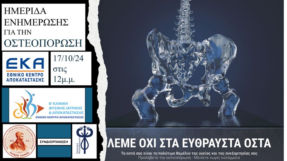 TRANSLATION IN GREEK: ❗️ΠΡΟΛΗΨΗ & ΑΝΤΙΜΕΤΩΠΙΣΗ ΟΣΤΕΟΠΟΡΩΣΗΣ❗️ Η Β' Κλινική Φυσικής Ιατρικής & Αποκατάστασης Εθνικό Κέντρο Αποκατάστασης, σε συνεργασία με το Επιστημονικό Τμήμα Γηριατρικής Φυσικοθεραπείας του Πανελλήνιου Συλλόγου Φυσικοθεραπευτών και το Ινστιτούτο Αποκατάστασης & Πρόληψης Αναπηρίας 《Κλαύδιος Γαληνός》, πραγματοποιεί ενημερωτική ημερίδα, την Πέμπτη 17/10, στις 12 μ.μ. στο Εθνικό Κέντρο Αποκατάστασης. Το πρόγραμμα της εκδήλωσης ▶️Προεδρείο Marios Kalyviotis Χαρά Κωτσιοπούλου Yannis Dionyssiotis ▶️Ομιλητές ⏩Οστεοπόρωση: διάγνωση και θεραπεία Yannis Dionyssiotis MD, MSc., PhD Συντονιστής Διευθυντής Β' ΦΙΑπ ΕΚΑ ⏩Θεραπευτική άσκηση στην οστεοπόρωση Katerina Gkouma MSc. Φυσικοθεραπεύτρια, Υπεύθυνη δημοσίων σχέσεων Τμήματος Γηριατρικής Φυσικοθεραπείας ΠΣΦ ⏩Διατροφή και οστά Catherine Chremou MSc. Κλινική Διαιτολόγος - Διατροφολόγος, Υπεύθυνη Τμήματος Κλινικής Διατροφής, Νοσοκομείο Μητέρα ➡️ Θα ακολουθήσει ανοικτή συζήτηση με το κοινό Η εκδήλωση έχει ελεύθερη είσοδο #οστεοπόρωση #κατάγματα #osteoporosis #fractures