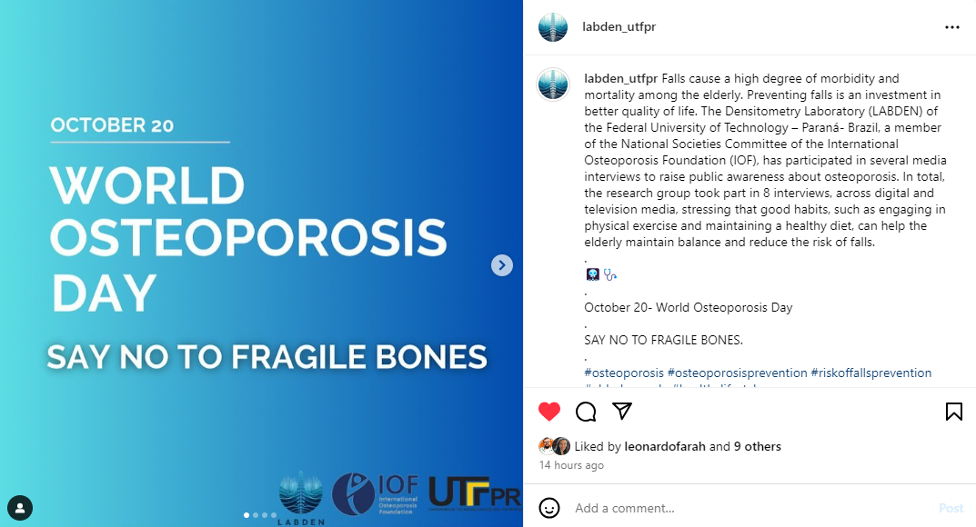 Falls cause a high degree of morbidity and mortality among the elderly. Preventing falls is an investment in better quality of life. The Densitometry Laboratory (LABDEN) of the Federal University of Technology – Paraná- Brazil, a member of the National Societies Committee of the International Osteoporosis Foundation (IOF), has participated in several media interviews to raise public awareness about osteoporosis.