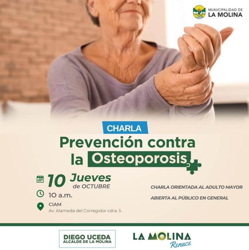 Charla: Prevention contra la Osteoporosis La osteoporosis es una enfermedad silenciosa que afecta cada vez más a nuestros adultos mayores. Cuando: Jueves 10 de octubre Hora: 10 a.m. Dónde: CIAM - La Molina Event info: Thursday, October 10, 2024 La Molina , Peru Organized by: la Municipalidad de La Molina Share event