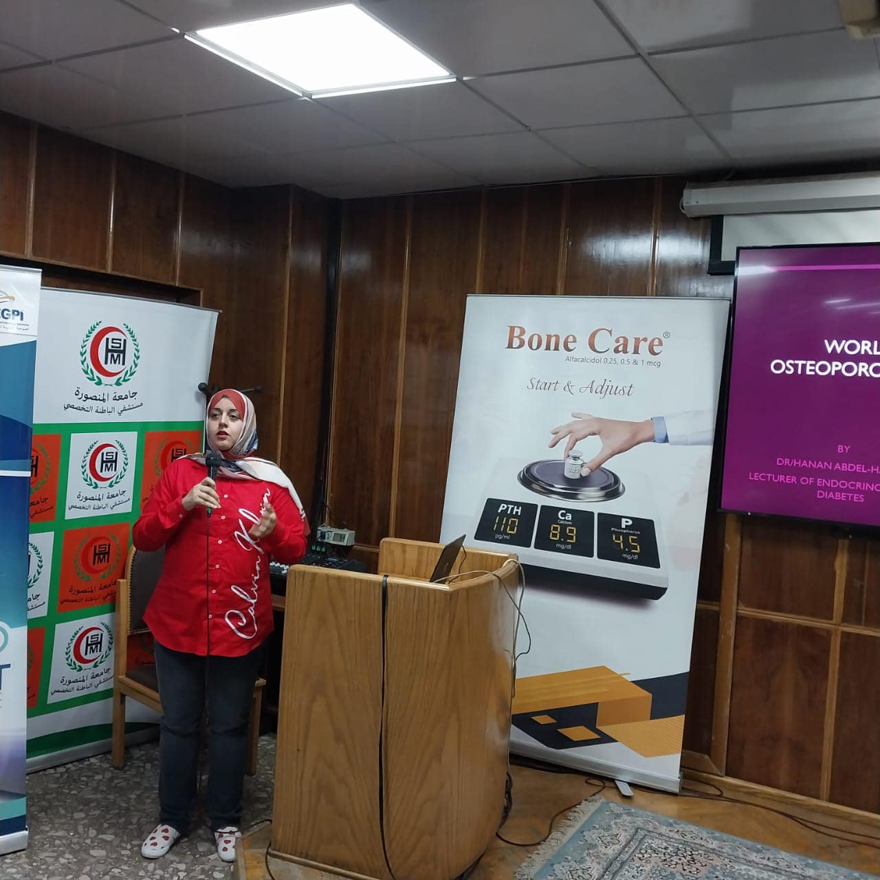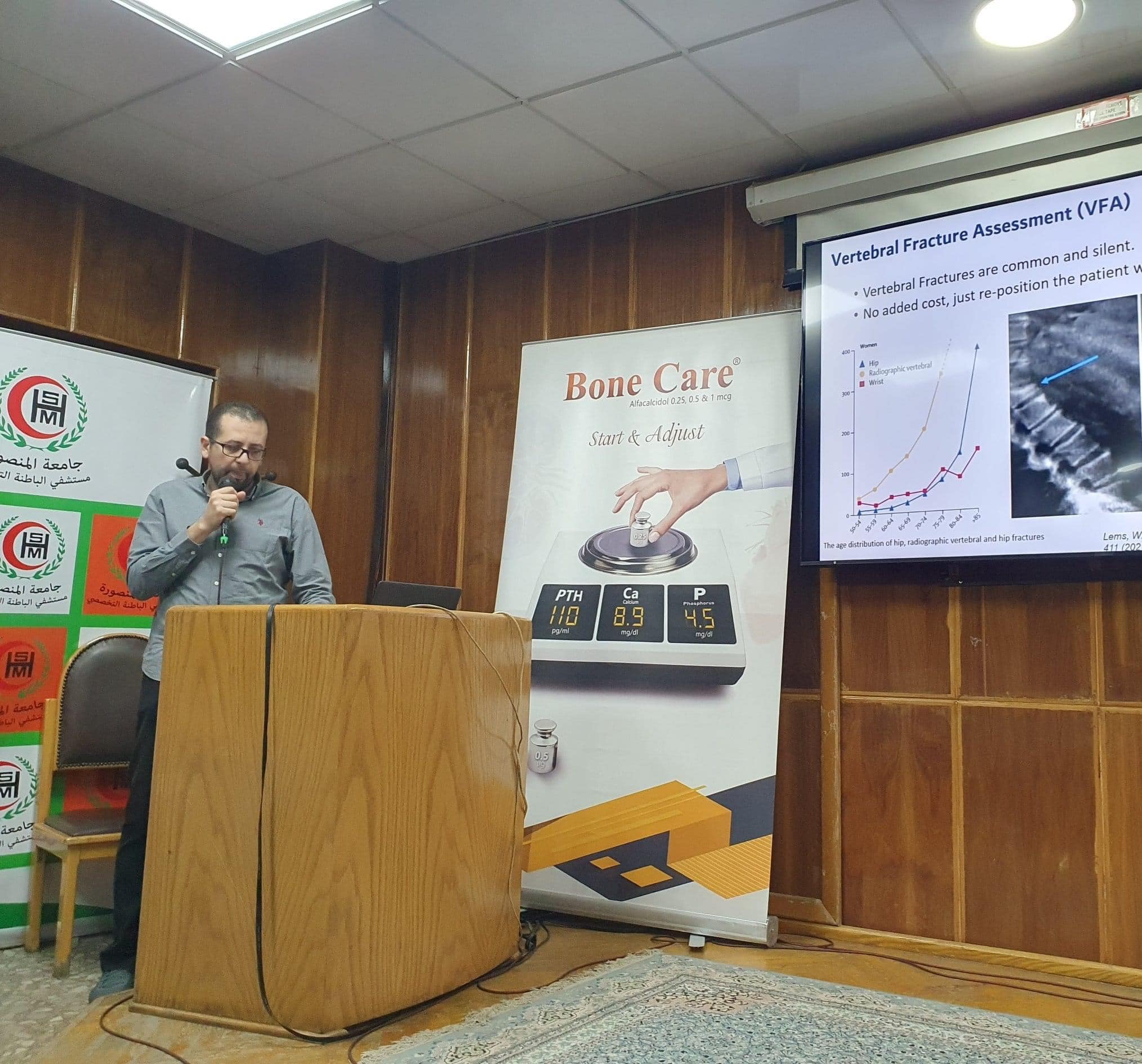 Awareness lectures to patients in Arabic about risk of osteoporosis and nutrition for better bone health with the aid of IOF brochures, then, a scientific meeting in English with staff members of different specialties and FLS team and discussing some different cases.