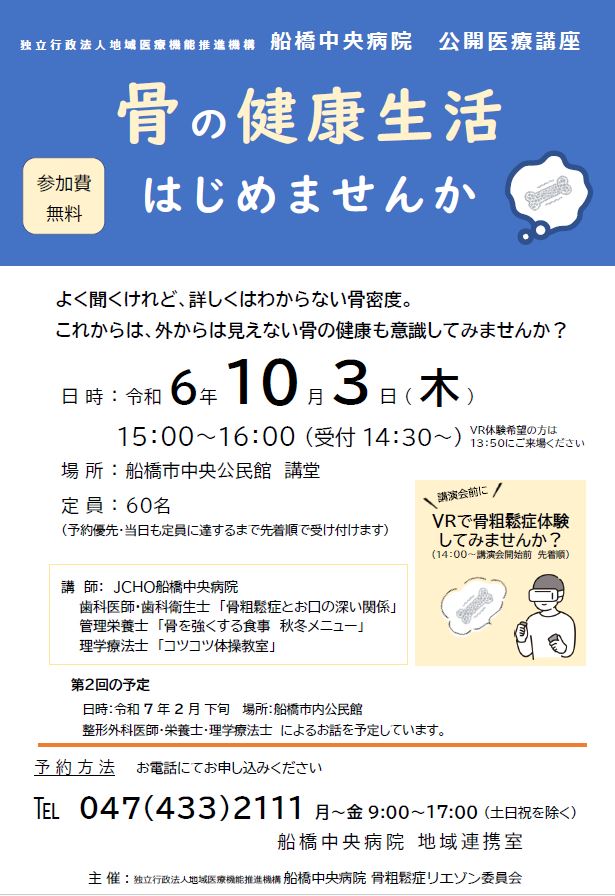 Public Lecture on osteoporosis to be held at Funabashi Central Community Center, 2-2-5 honcho Funabashi Event info: Thursday, October 3, 2024 Funabashi , Japan 6-13-10 Organized by: JCHO Funabashi Central Hospital Public Lecture on Osteoporosis Share event