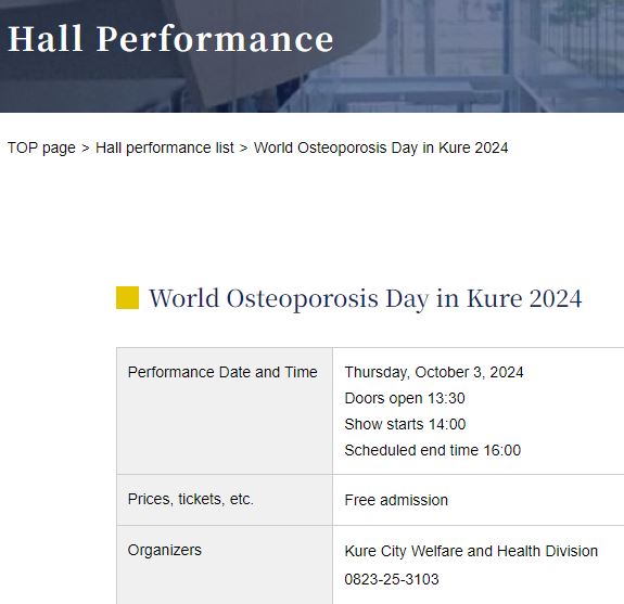 For further information visit: https://www.kure-shimin.jp/?cn=101043 Event info: Thursday, October 3, 2024 Kure , Japan Shinnipponzoki Hall Organized by: Kure City Welfare and Health Division Share event